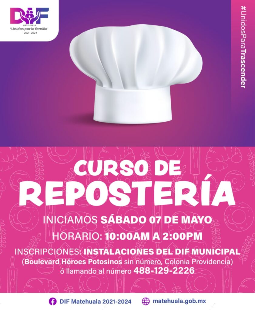 El Sistema Municipal para el Desarrollo Integral de la Familia (SMDIF) invita a la ciudadanía en general a participar en el curso básico de repostería, el cual dará inicio el próximo sábado 7 de mayo de 10 de la mañana a 2 de la tarde.