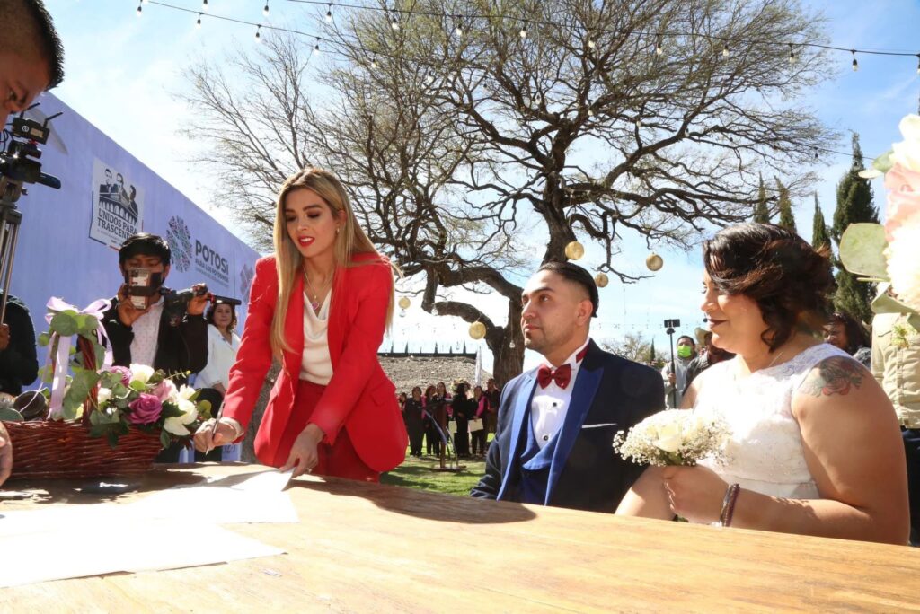 A nombre suyo y de su esposo, el Gobernador Ricardo Gallardo Cardona, felicitó a los nuevos matrimonios y agradeció a las y los presentes por creer y confiar en los programas y acciones que el Gobierno del cambio emprende a favor de las familias potosinas; añadió que espera que el amor guíe cada una de las decisiones que emprendan, “porque como dijo Octavio Paz cuando dos se besan, un mundo nace”.