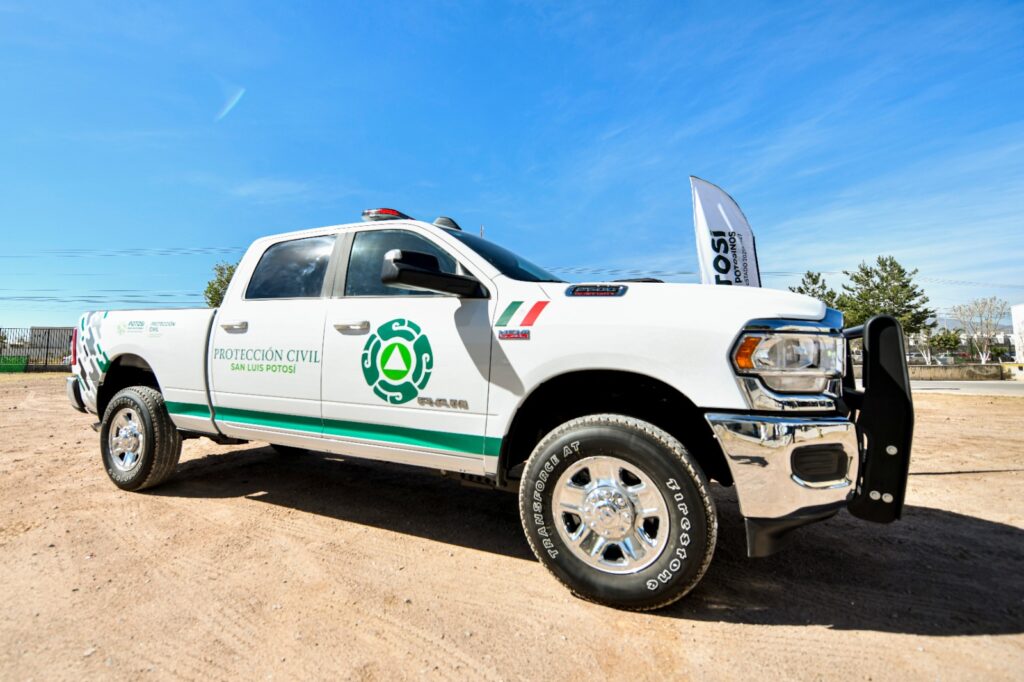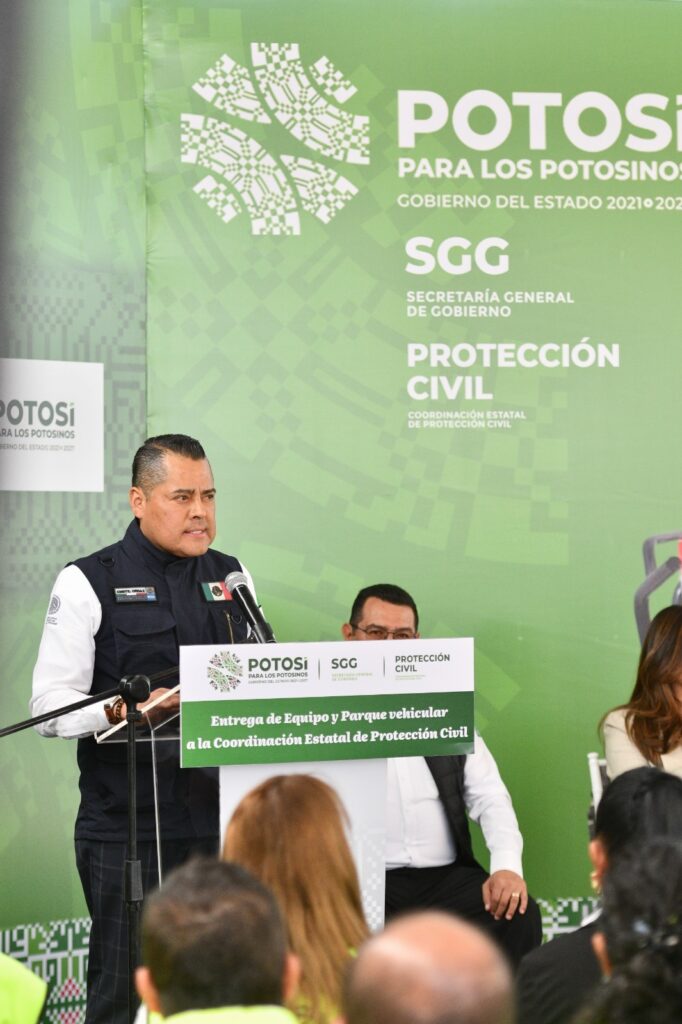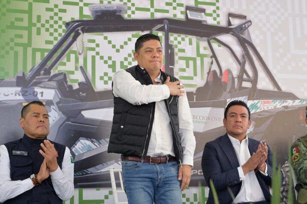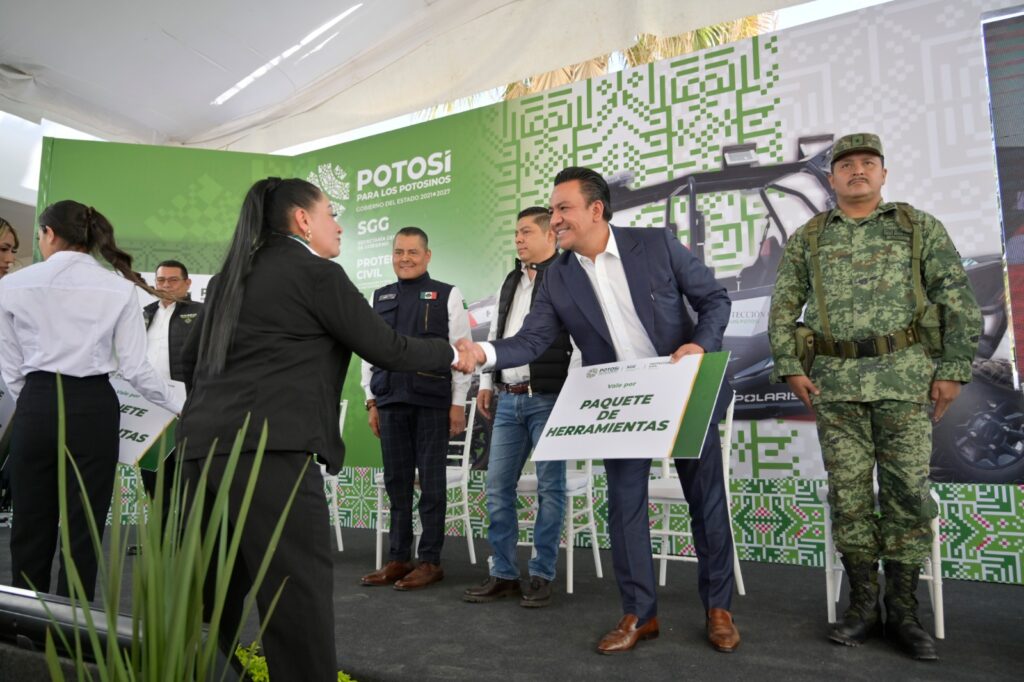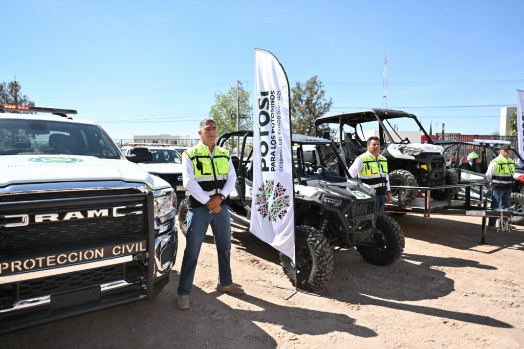 Junto al secretario general de Gobierno, J. Guadalupe Torres Sánchez y al titular de la CEPC, Mauricio Ordaz Flores, el Gobernador Ricardo Gallardo, hizo entrega simbólica de una camioneta equipada para atender con mayor eficacia las tareas de emergencia que se presenten, además de dos remolques cama baja, paquete de herramientas, bomba tragasólidos, motosierras, vehículo defender can-am y equipo diverso para protección personal.