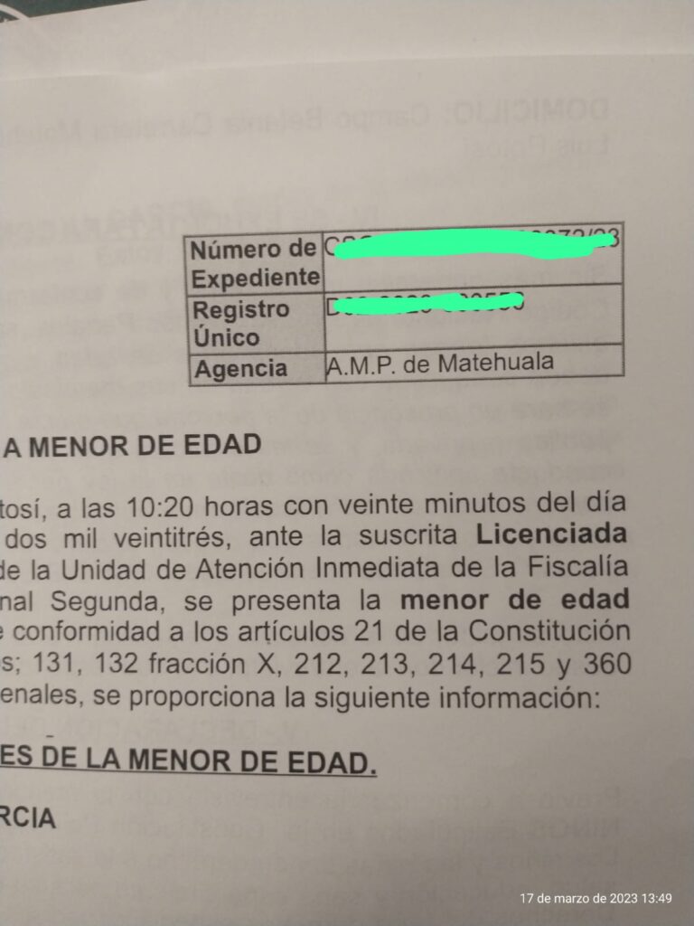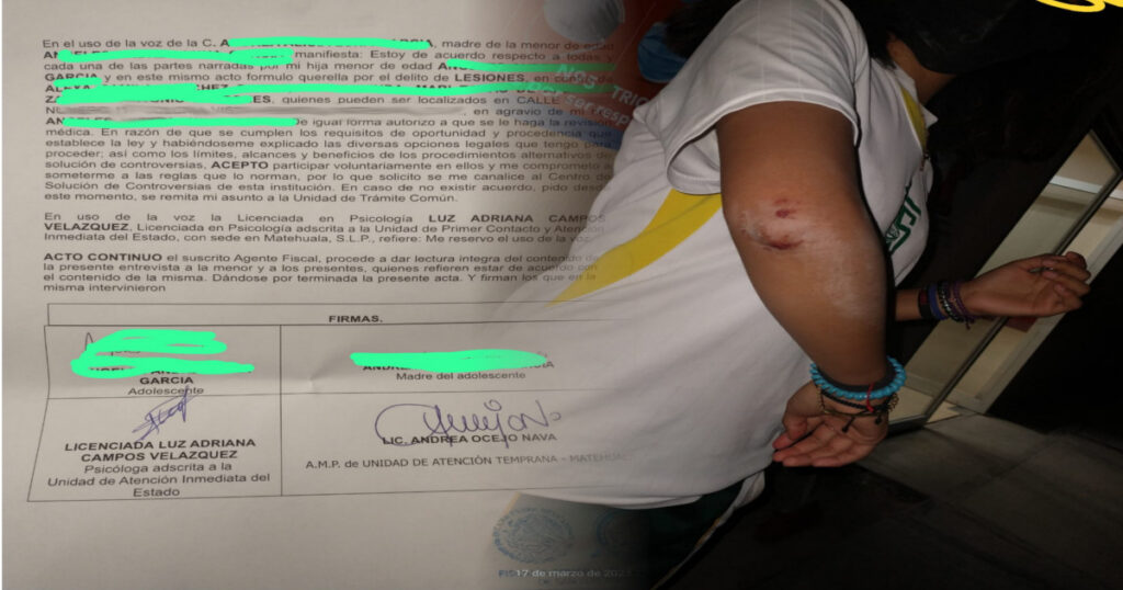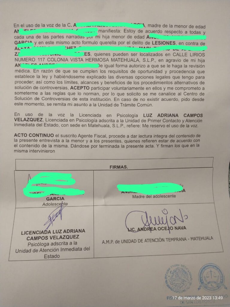 El miércoles 15 de marzo a las 19:45 aproximadamente mi hija venía caminando por la calle Francisco I madero a la altura del panteón Hidalgo….cuando la alcanzó su agresora y le dijo con palabras antisonantes que que p#$@ traía con ella y para pronto agarro a mi hija de los cabello y la tiró al suelo ya cuando las dos estaban en el suelo se bajan los acompañantes de esta misma y le dicen gritándole «pégale, pégale» y en eso el padrastro de está niña agarra a mi hija del cabello y le da 3 golpes en la cabeza con el puño cerrado y las tías y mamá de la misma le dan patadas en el cuerpo a mi hija ya dejan a mi hija y se suben al carro y le dan fuerte al carro y se van … Ya en eso mi hija me marca al celular llorando contándome un poco de lo que pasó y enseguida fui alcanzarla más allá cerca de donde estaba