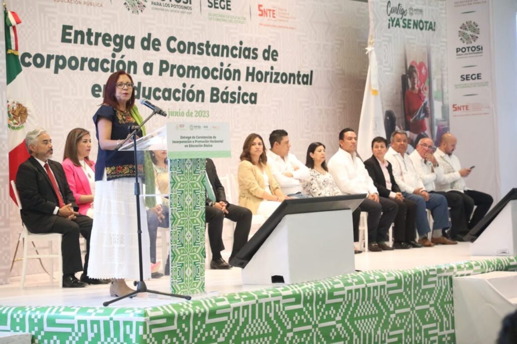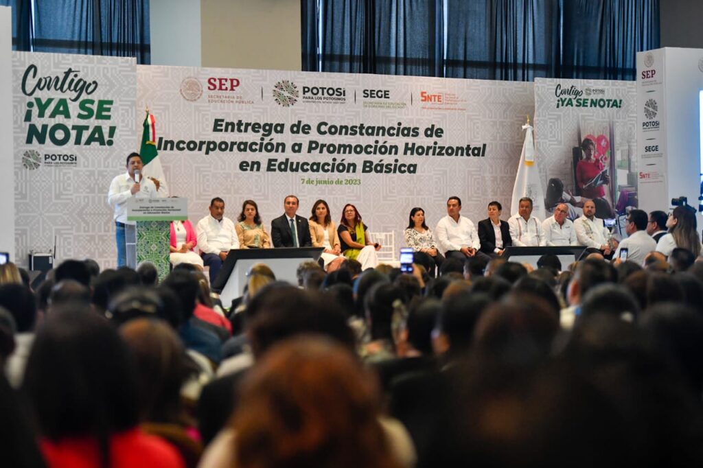 Para reconocer la vocación, dedicación y compromiso de mil 779 docentes estatales y federales, el Gobernador de San Luis Potosí Ricardo Gallardo Cardona, acompañado de la titular de la Secretaría de Educación Pública (SEP), Leticia Ramírez Amaya, tras una convocatoria abierta y transparente, entregaron constancias de incorporación a Promoción Horizontal en Educación Básica, por 39 millones de pesos.
