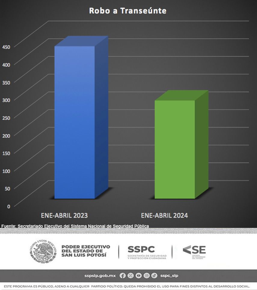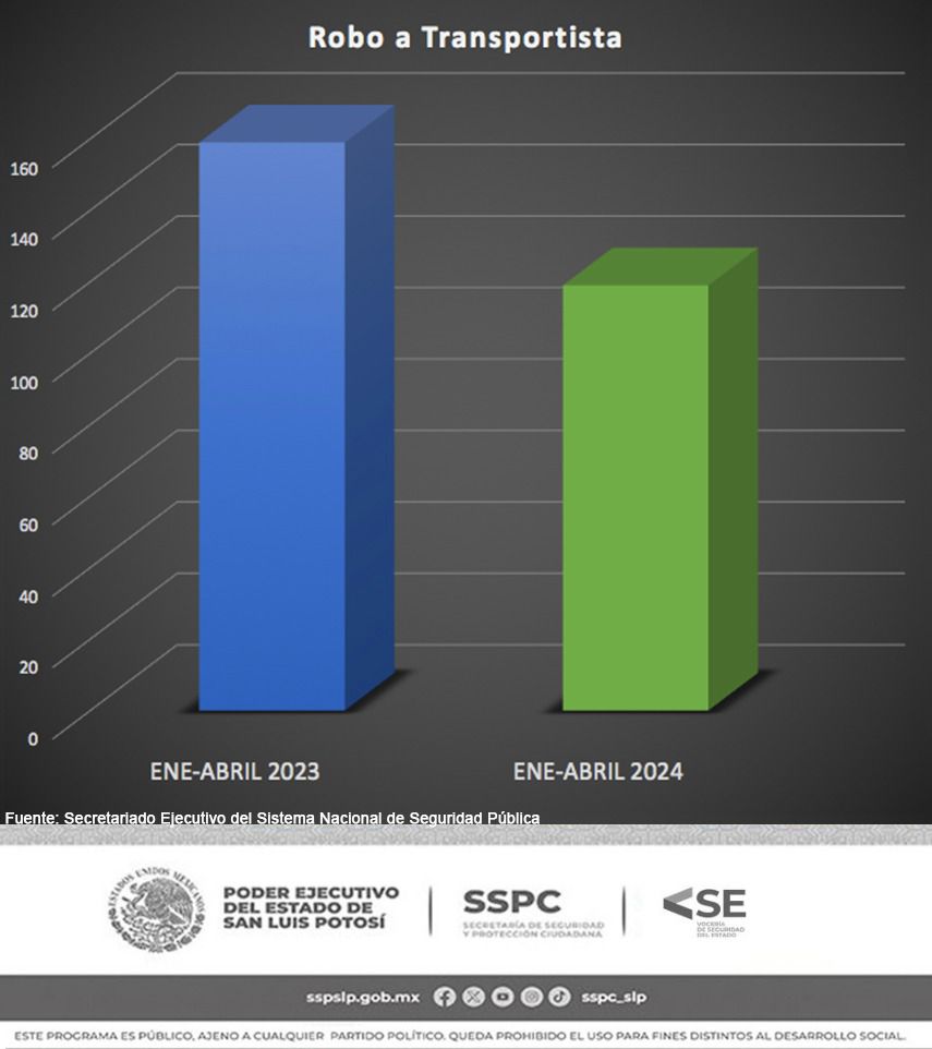 De acuerdo con datos del Secretariado Ejecutivo del Sistema Nacional de Seguridad Pública (SESNSP), durante este periodo, tuvieron disminución las modalidades de robo: en transporte público individual de 10 casos a solo uno, es decir 90 por ciento menos; en transporte colectivo de 39 a nueve casos; a transeúnte de 430 casos a 277; a transportista con 40 casos menos que los 159 registrados en 2023; y a casa y negocio decrecieron un 20 y 23 por ciento, respectivamente.