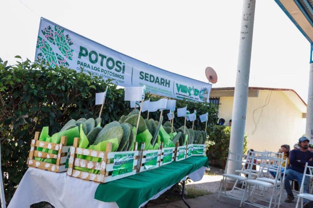 En cumplimiento con la instrucción del Gobernador Ricardo Gallardo Cardona, de seguir impulsando cultivos resistentes al cambio climático y la sequía extrema, así como fortalecer la economía de las mujeres potosinas, la Sedarh en colaboración con los gobiernos municipales de Moctezuma y Venado, envío más de nueve mil raquetas de nopal para iniciar la producción de alimentos para 200 familias y forraje para el ganado.