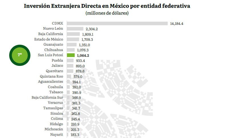San Luis Potosí, ubicado como séptimo a nivel nacional con más de mil 64 millones de dólares