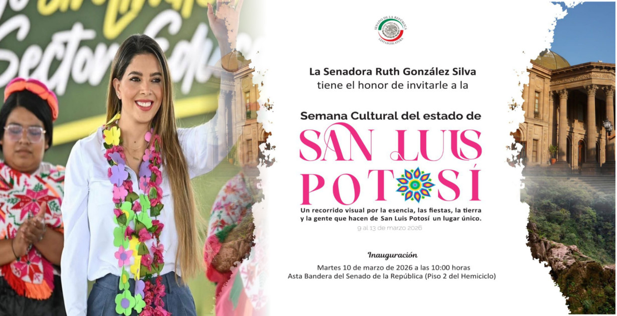 - Del 10 al 13 de marzo se realizará la Semana Cultural de San Luis Potosí, un evento que reunirá expresiones artísticas, artesanales y gastronómicas representativas del estado.